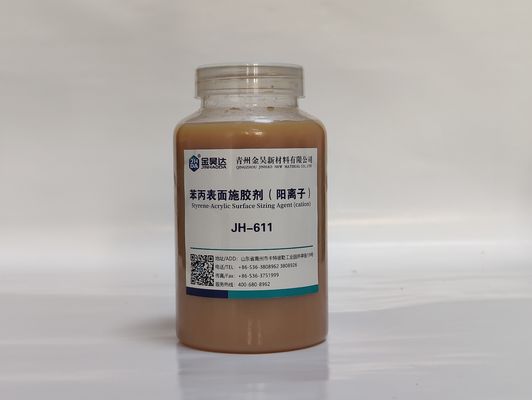 Apresto catiónico de la superficie del acrílico del estireno de JINHAODA JH-611 es un líquido marrón claro con las propiedades superiores para el tratamiento de las superficies de papel. Es apresto catiónico de la superficie del acrílico del estireno integrado por el copolímero de los acrilatos, y es soluble en agua. El agente proporciona propiedades excelentes de la dispersión, de la resistencia de agua y de la fuerza mojada, y es estable en las temperaturas de 0-40℃.